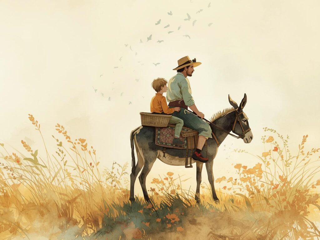Un peu plus loin, un vieux paysan gronda : « Un jeune homme comme toi, assis, et ton père qui marche ? Honte à toi ! » Le fils descendit, le père monta. Mais bientôt, trois femmes les arrêtèrent : « Regardez ce père égoïste ! Laisser son fils marcher sous ce soleil ! » Le père soupira, et fit monter l’enfant.